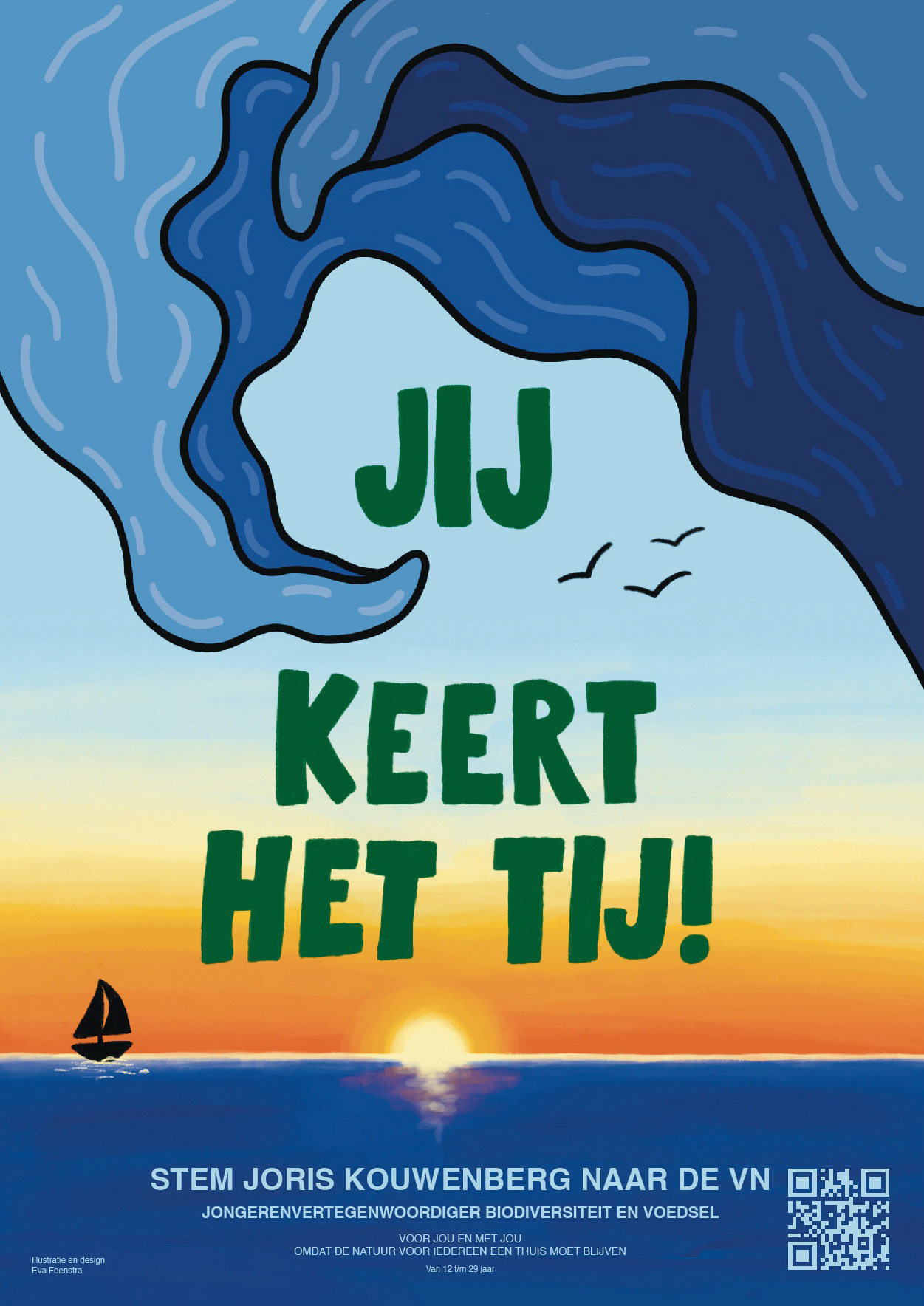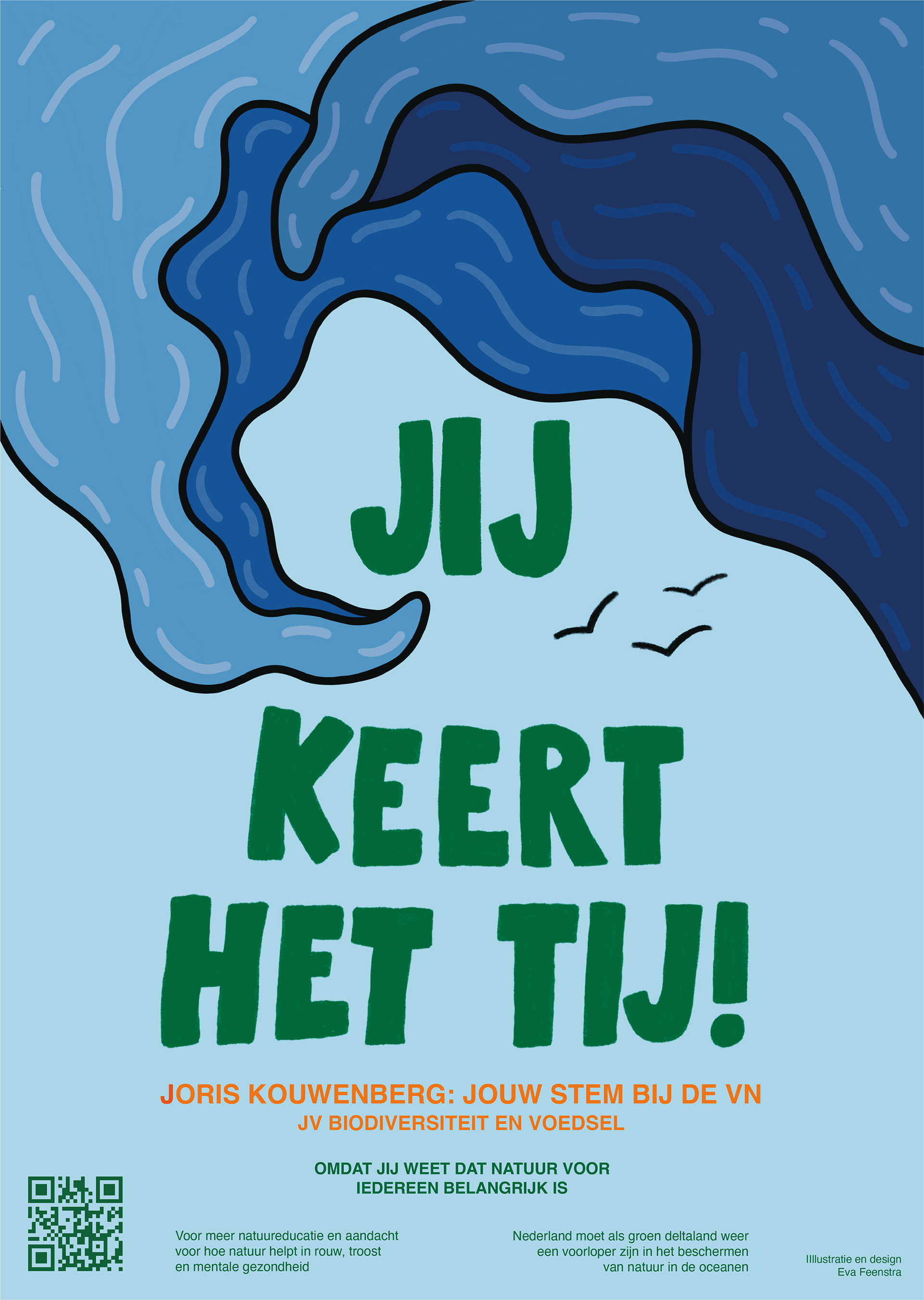 He came with the clear vision that he wanted to have a wave on the poster. This fit well because of his slogan "You Turn the Tide!" but also because he has studied Marine Sciences and has a great connection with the sea. I used the slogan quite literal and came up with the idea to turn the wave upside down. This created a nice visual effect that didn't feel overused (because of the iconic The Great Wave off Kanagawa by Katsushika Hokusai) With his message he really wanted to make it clear that he wants to involve everyone and listen to the people. To emphasize this, I used the tail of the wave almost like an arrow, highlighting the 'You'.