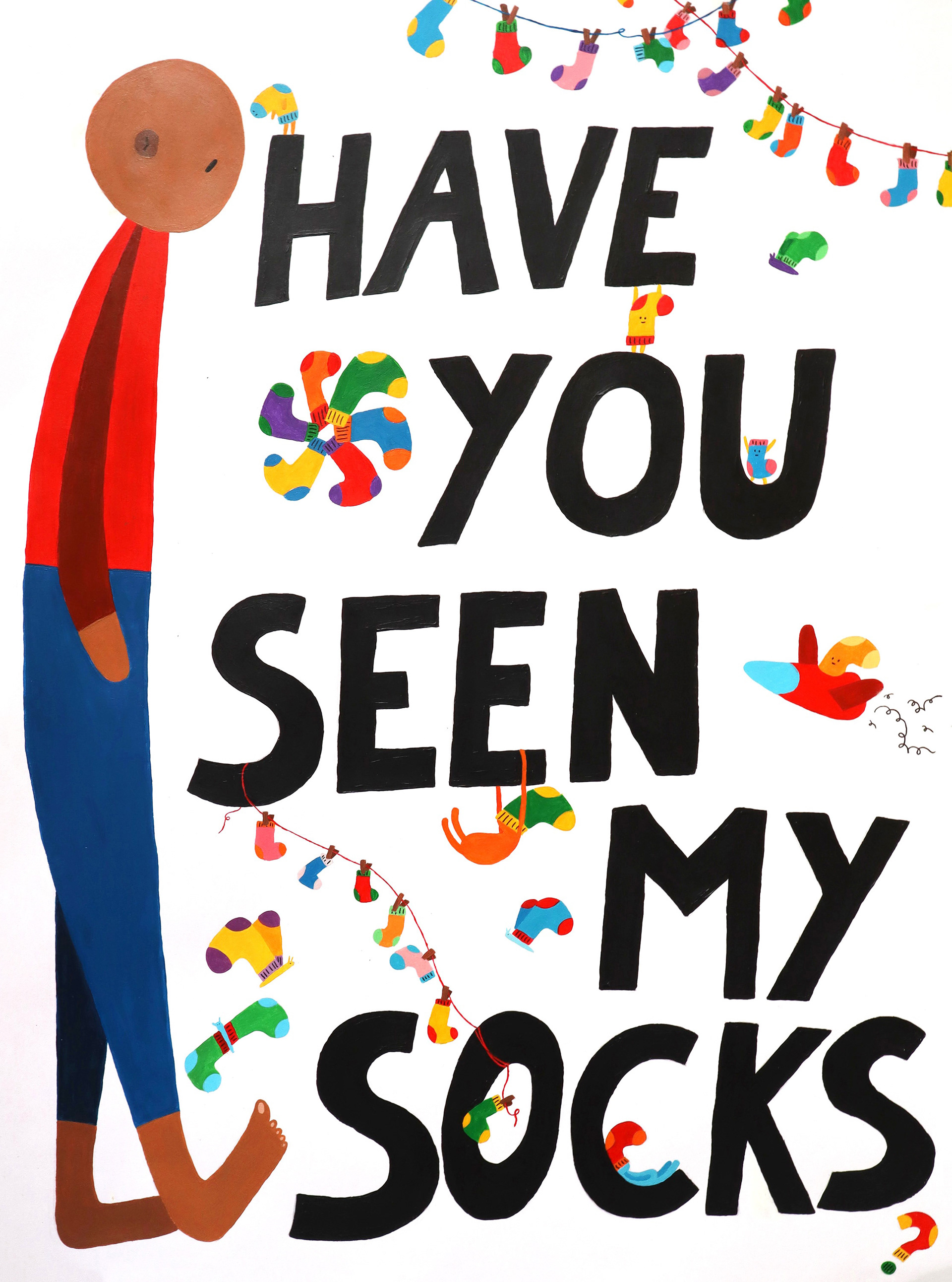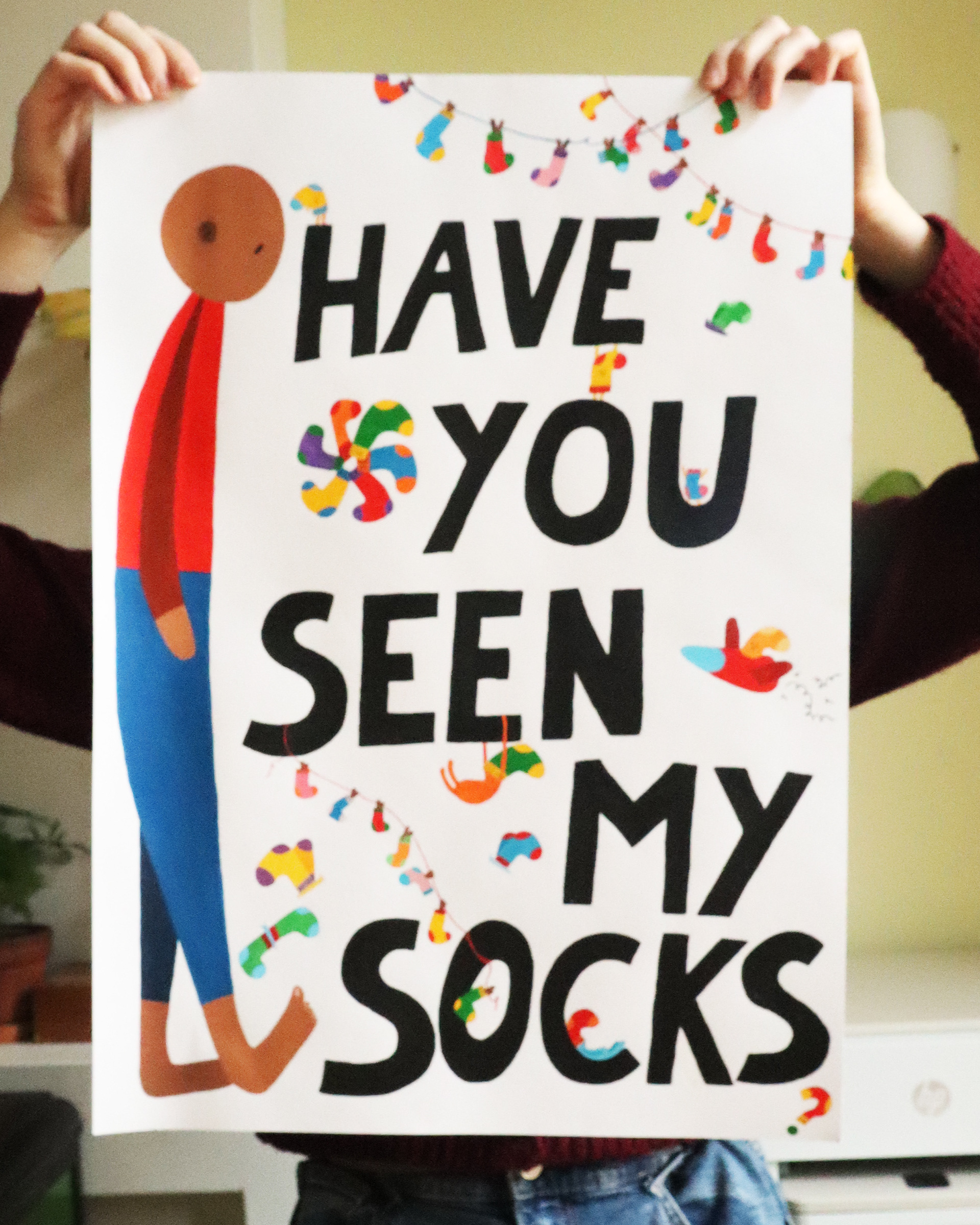 A hand-painted poster about the struggle of the disappearing socks, but also about the luxury of having socks at all.